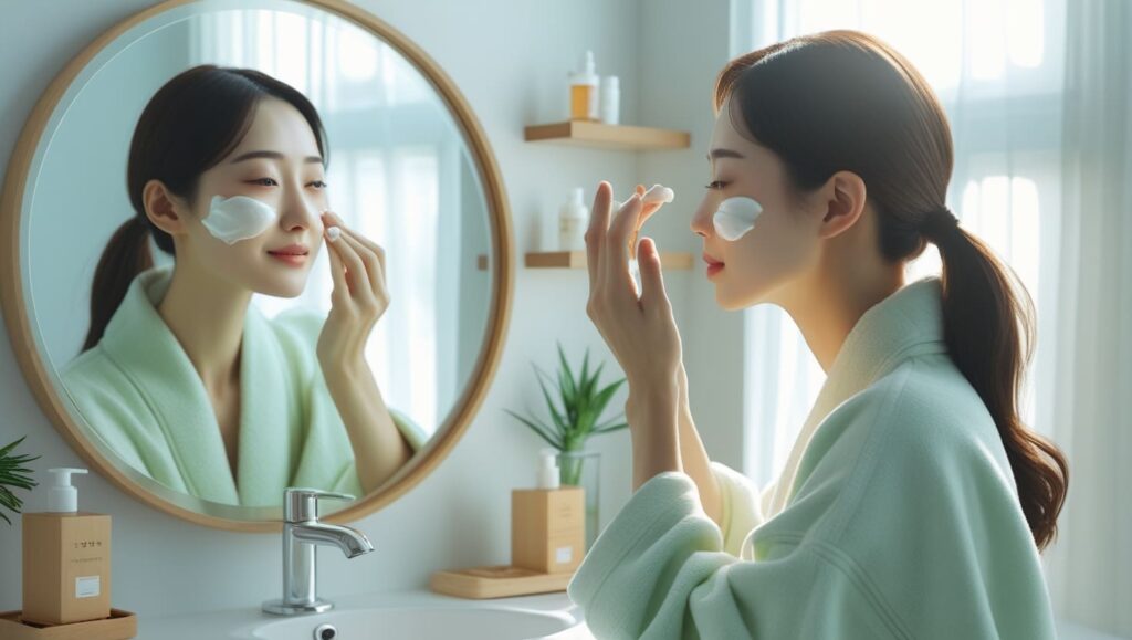 세안을 두 번 하고 토너로 메이크업을 제거한 후, Skin + Me 크림을 한 층 발랐습니다. 초기에는 피부가 성분에 매우 민감하게 반응했기 때문에, 권장되는 10분을 기다리지 않고 보습제를 조금 더 일찍 발라 피부가 적응하도록 했습니다.